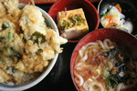「てんこもり」いうお店。春の天丼セット(さより、えび、菜花などのってます)をいただきました。