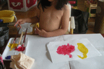 描いて後は、絵の具が混じり合って色が変わるのを楽しみ、筆の感覚を楽しんでいるかと思ったら、