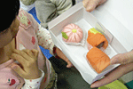 職人のおじさんの言うとおりに、丸めたり、伸ばしたり、道具をつかって和菓子を作りました。とっても秋らしい和菓子ができあがりました。