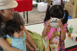 輪切りにした枝を、紙やすりで擦り、ペンやスタンプをして、木工ボンドでコーティングして紐を通して出来上がり。まぁーたんもネムーの仕事を見学。
