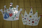 王冠に切った画用紙にクーピーや、キラキラのラメをボンドでペタペタ張って、自分の王冠を作りました。