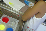 保育園の後、以前図書館で借りた本の中から色水遊びをしてあそびました。最初は、習字紙に水で山のように絵を描いて手でちぎって、色を塗っていくとカキ氷の出来上がり。