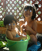 すると、まぁ〜たんと一緒にベランダで水遊びしてました。