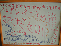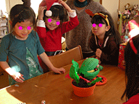 矢印のとおりに歩いていくと、半纏を着たおかしな女の子がドアを開けてくれ、ふしぎな呪文を唱えながら(忍術のよう)変身したり、転がったりそれはそれは不思議なパーティーでした。(笑)