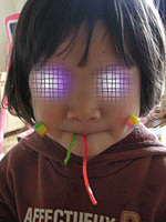 そして、↓の写真は、ネムーがお菓子でまぁ〜たんをカメレオンにして遊んでいました。まぁ〜たんもうれしそうでした。