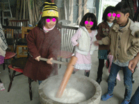 まずは、御鏡さん用を作ってから、子供達にももちをつきつきたたのおもちを食べさせてもらいました。軟らかくてとってももびて美味しかったです。