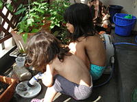 な〜んにも予定のない土曜日。掃除したり、部屋の片付けでドンドン手を広げてしまい、ベランダの大掃除がまじまりました。ホースを取り付けると、もう、娘達が駆けつけてきて脱ぎだし遊びだしました。私は横でせっせと汗をかきかき、拭き掃除、掃き掃除。