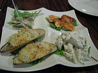 サングリアで乾杯で始まり、前菜4種、アンチョビとガーリックと野菜サラダ、スモークサーモンのピザ(スペイン風で)、シーフードのパエリアなどなど他にもたくさ〜ん食べました。